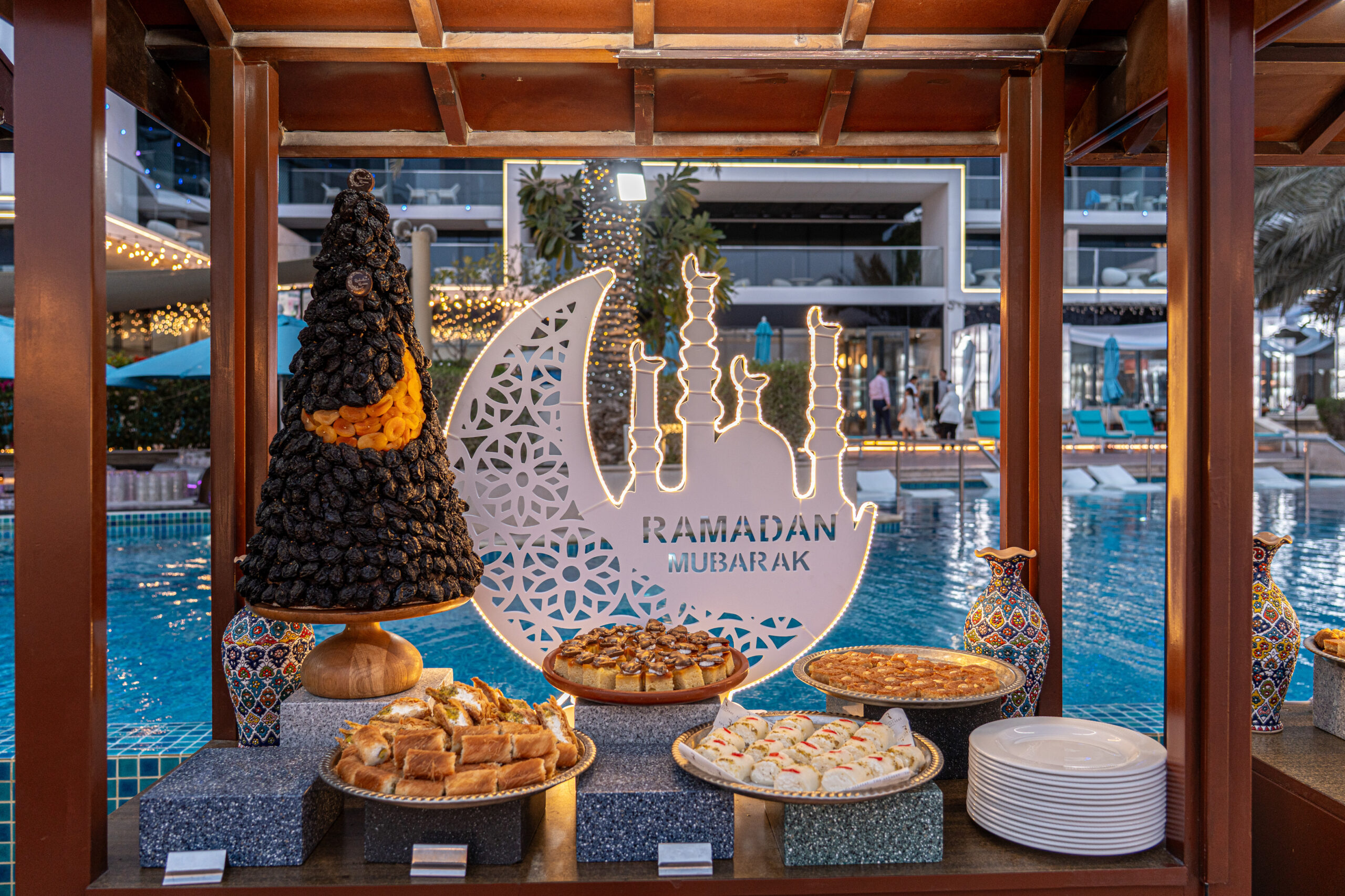 As the sun dips behind the Arabian Gulf, gather in a serene seaside setting and enjoy a thoughtfully curated buffet featuring traditional Arabic favourites, international specialties, and live cooking stations.